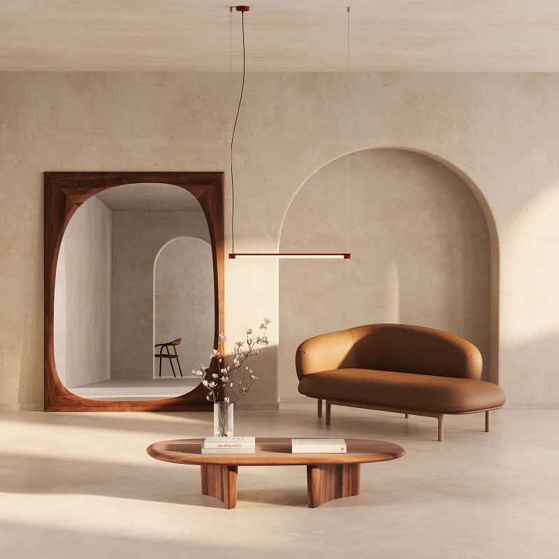 Mirrors are part of the Monument collection, which combines furniture with sculptural elements. Irregular, massive wooden frames transform the mirror into a decorative wall piece. The mirrors work as stand-alone objects or can be combined into compositions. They come in various sizes, ranging from wall-mounted to oversized and freestanding mirrors.